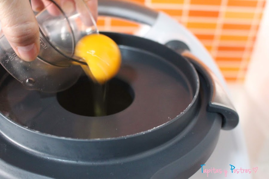 Cuando ya esté templada ponemos la maquina en marcha a velocidad 5 y vamos echando por el bocal los tres huevos uno a uno, esperando entre uno y otro que se integren bien.