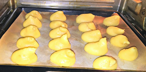 Ahora pondremos la pasta en la manga pastelera y haremos montoncitos en la bandeja del horno, que habremos cubierto con papel de hornear, y los hornearemos a 170ºC durante 15-20 minutos o hasta que veamos que están doraditos. Los retiramos del horno y dejamos enfriar.