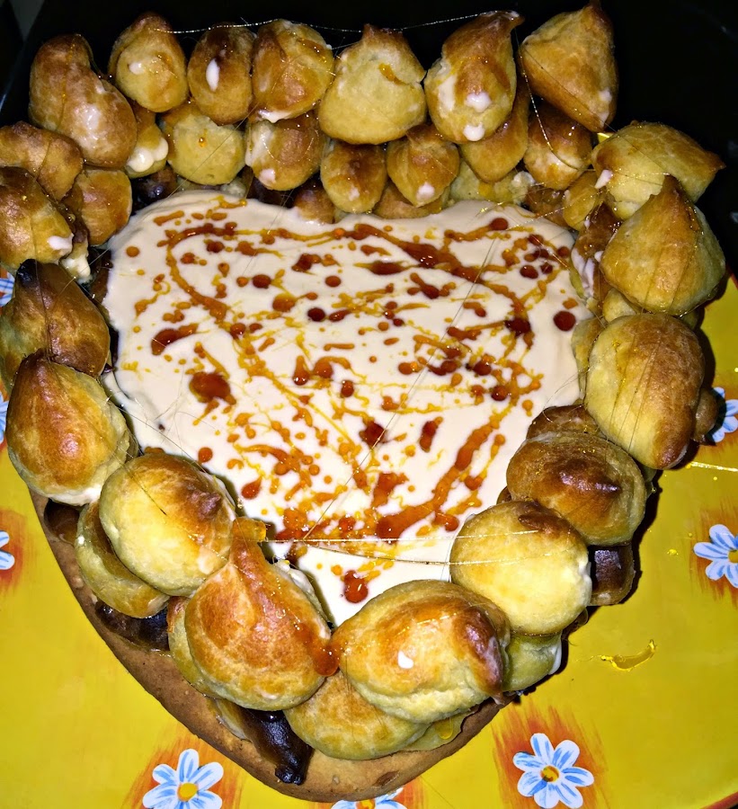 Y ahora pasamos a montar la tarta. Dispondremos la base de masa quebrada en una fuente o bandeja. Iremos untando los profiteroles, con generosidad, en el caramelo para ir pegándolos en el contorno de la base, uno al lado del otro, asegurándonos que no quedan huecos entre unos y otros para que no se salga la crema del relleno de la tarta. Paso que repetiremos para hacer varios pisos, en mi caso hice 3 pisos. Cuando estén listos los profiteroles, rellenamos el centro de la base con la crema Chiboust.