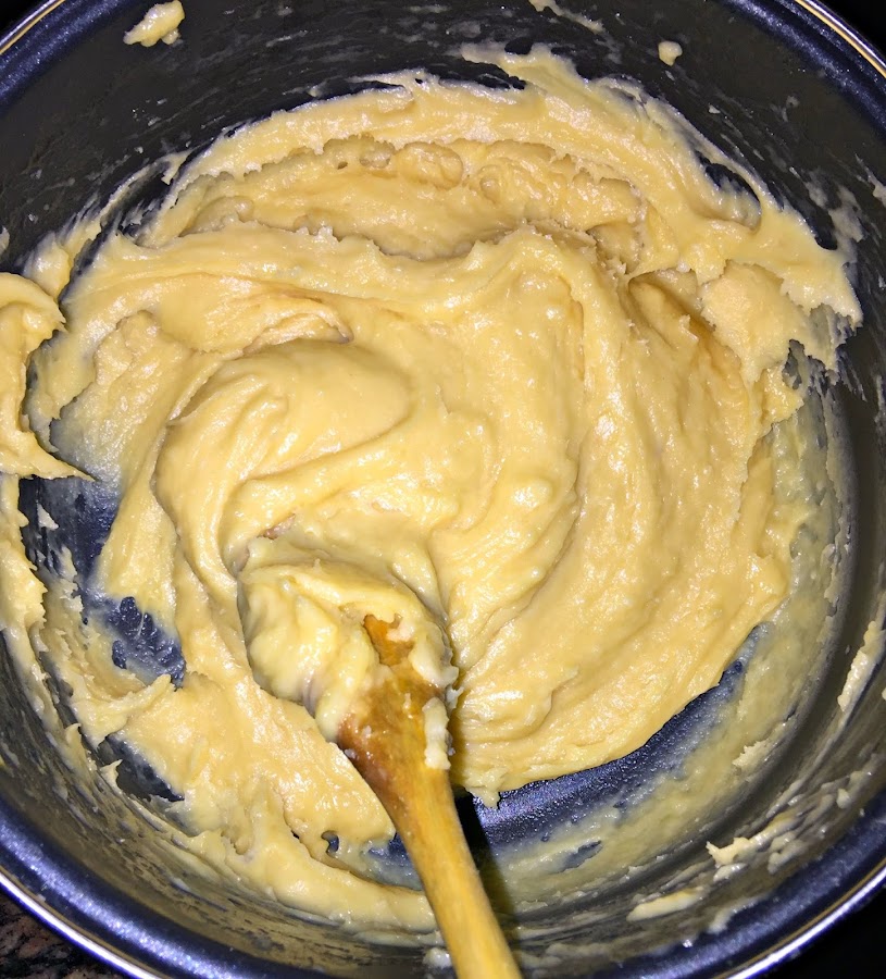 Ponemos en un cazo al fuego la leche, la mantequilla, la manteca y la sal. Cuando comience a hervir añadimos la harina, bajamos el fuego, y sin dejar de remover, añadimos un huevo, hasta que no se haya integrado del todo no añadimos el siguiente; y así con el resto de los huevos. Cuando terminemos, retiramos del fuego y dejamos reposar. Tiene que quedar una masa homogénea y que se despegue de las paredes.