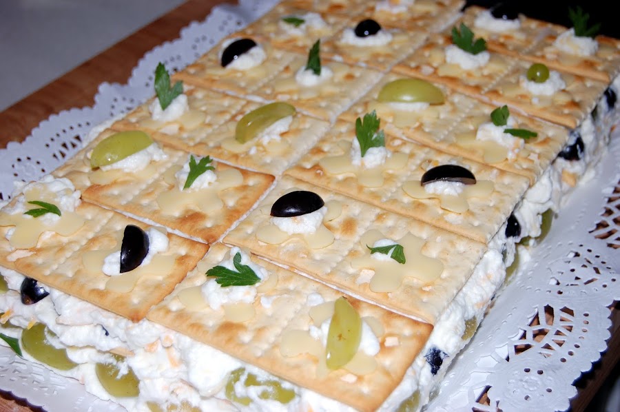 Extendemos una capa de la mezcla de nata (crema de leche) y queso y colocamos las uva partidas por la mitad y sin semilla,cubrimos con otra capa de nata (crema de leche) y queso , repetimos la operación, galletas,capa de nata (crema de leche) y queso, uvas y galletas.