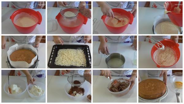 Colocamos la base de la tarta en un plato y empapamos con el almíbar que quede húmeda; encima de esta repartimos de forma uniforme la nata montada (crema de leche) con el cacao.