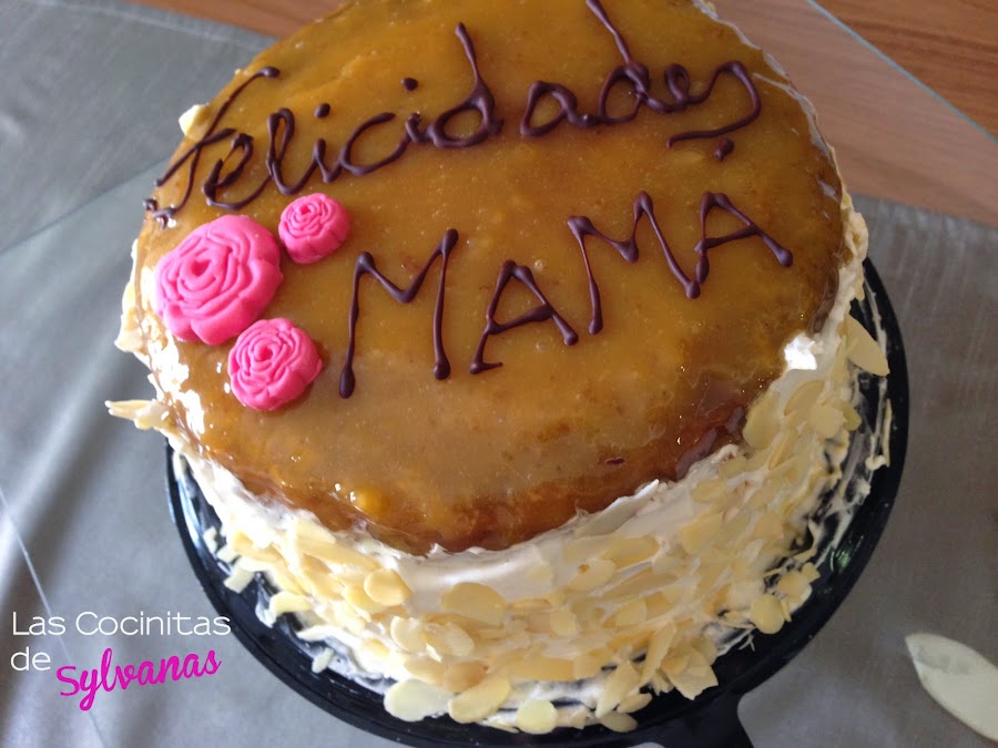 Cortamos en bizcocho en tres partes. Bañamos con el almíbar la primera capa y cubrimos con una buena capa de nata (crema de leche), ponemos la segunda capa bañar con el almíbar y cubrir con una buena capa de trufa. Poner la ultima capa, bañar con el almíbar y cubrir con la crema de yema, espolvorear con azúcar moreno y quemar la superficie. Cubrir de nata (crema de leche) todo el contorno y decorar con almendra laminada.