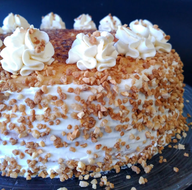 No he cubierto la parte superior con nata (crema de leche) por qué una vez al tostar la yema,ésta se derritió y no sabes el desastre de tarta,toda llena de chorrones.