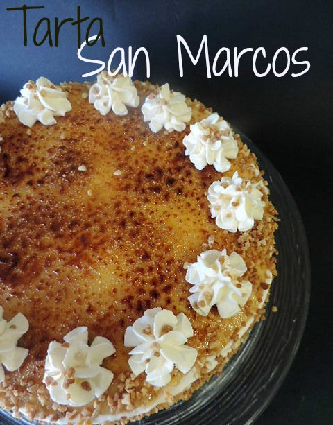 La tarta lleva un bizcocho genovés con relleno de nata montada (crema de leche) y trufa cocida que es la que más me gusta para el relleno de tartas.Cubierta de yema tostada,ésta parte puede que sea la más complicada,pero siguiendo los pasos seguro que no tenéis ningún problema como no lo he tenido yo, ya que la fuente es más que fiable.Para la yema pastelera le he cogido prestada la receta a María de Cosicas dulces .He probado varias recetas y esta es la que más me gusta.Queda perfecta,no se cuarte ni se agrieta al tostar,lo dicho perfecta y deliciosa.