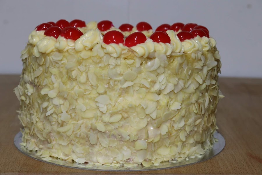 Decorada con almendras fileteadas y guindas