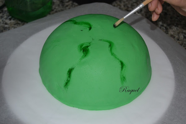 Le dije, me la juego y si queda mal nos hemos cargado la tarta, intente probar con un poco del mismo colorante y unas gotas de agua y nos gusto!! así que a poner mas manchas.
