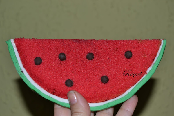 A mi se me ocurrió aprovechar un trozo de esa parte sobrante de bizcocho y hice una tajada de sandia y le puse unas pepitas de chocolate para simular las pepitas.