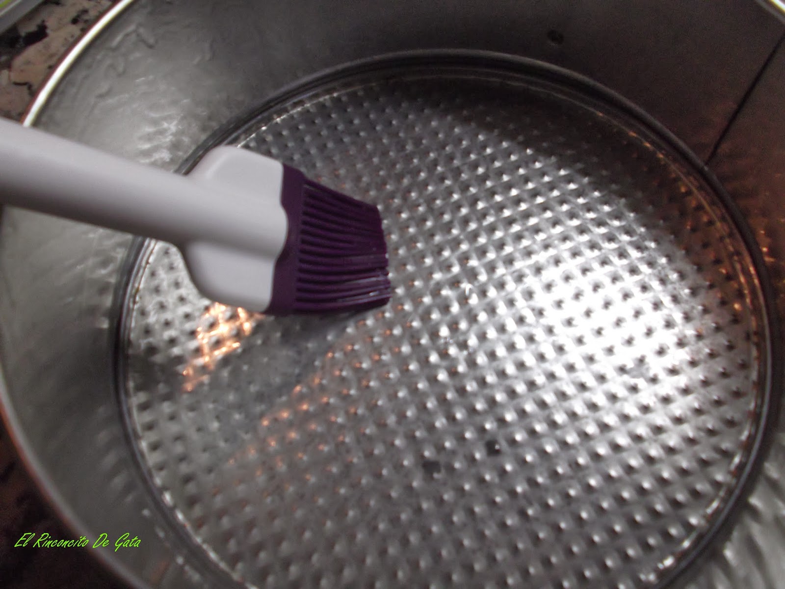 Cuando ya tengamos la masa lista, cogemos un molde (yo he usado uno de 21cm de diámetro y 7cm de alto) y lo untamos con aceite, para que no se nos peque el bizcocho.