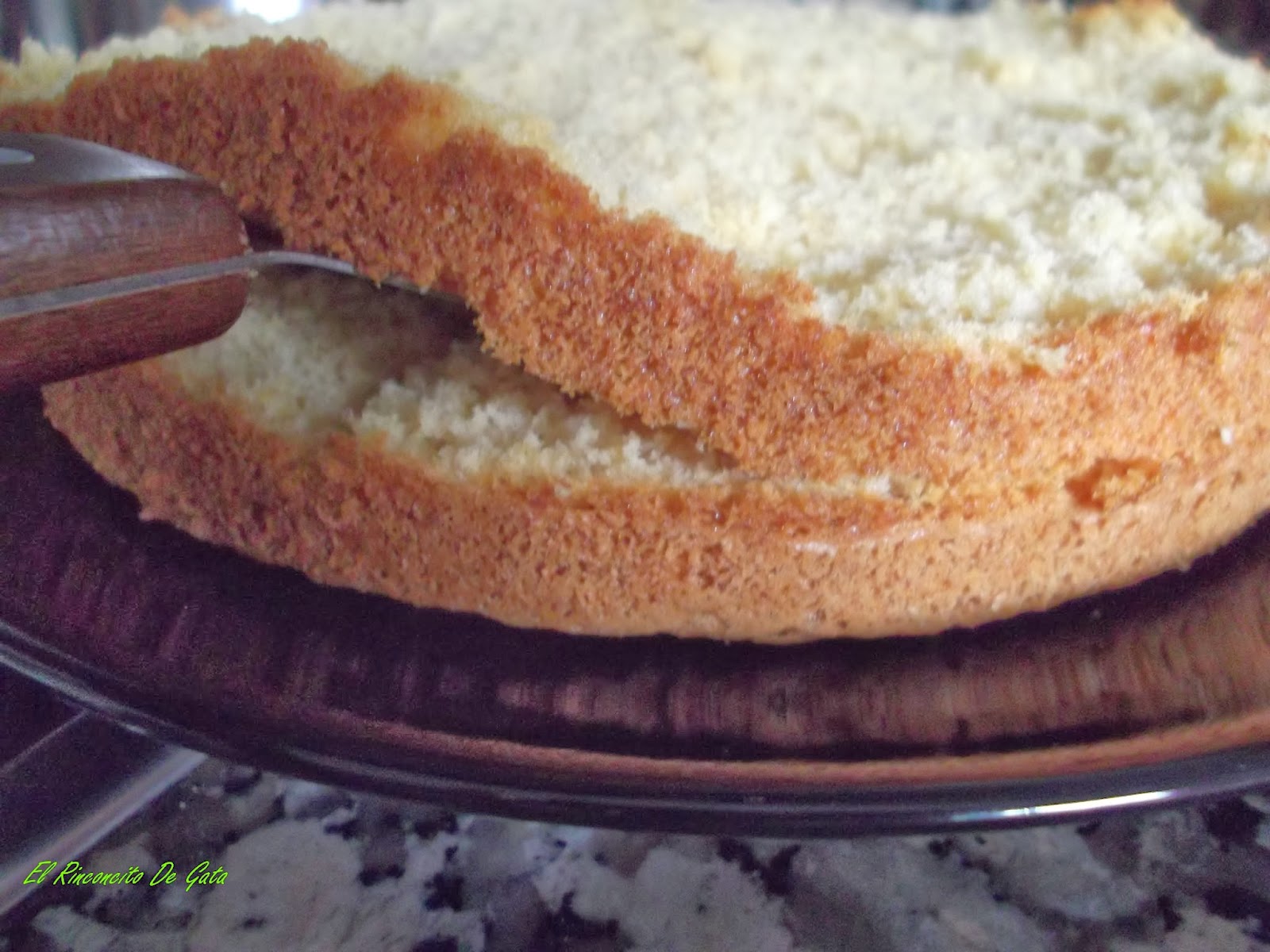 Una vez se haya enfriado, lo cortaremos de forma que nos queden tres capas de bizcocho.