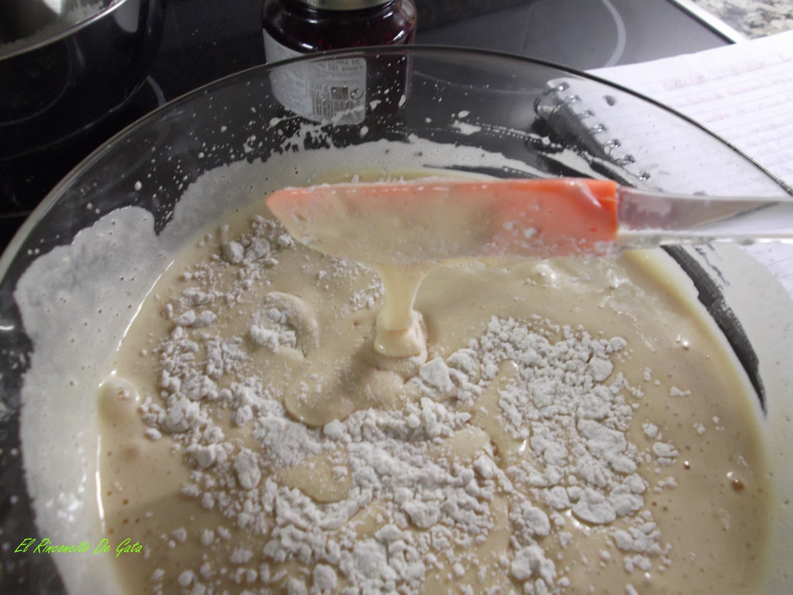 Cuando veamos que la masa ya no sube más, empezamos a añadir la harina con la levadura tamizada, hacerlo poco a poco y con movimientos envolventes, para que no se baje la masa.