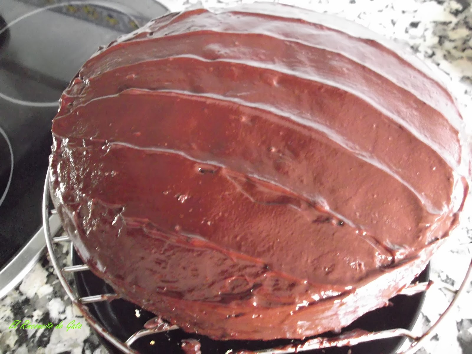 Ahora cubriremos la tarta con el chocolate de cobertura, para ello lo pondremos en un cuenco y le daremos tandas de 30 segundos en el microondas, sacamos y movemos, así hasta que esté liquido. Cubrimos todo el bizcocho.