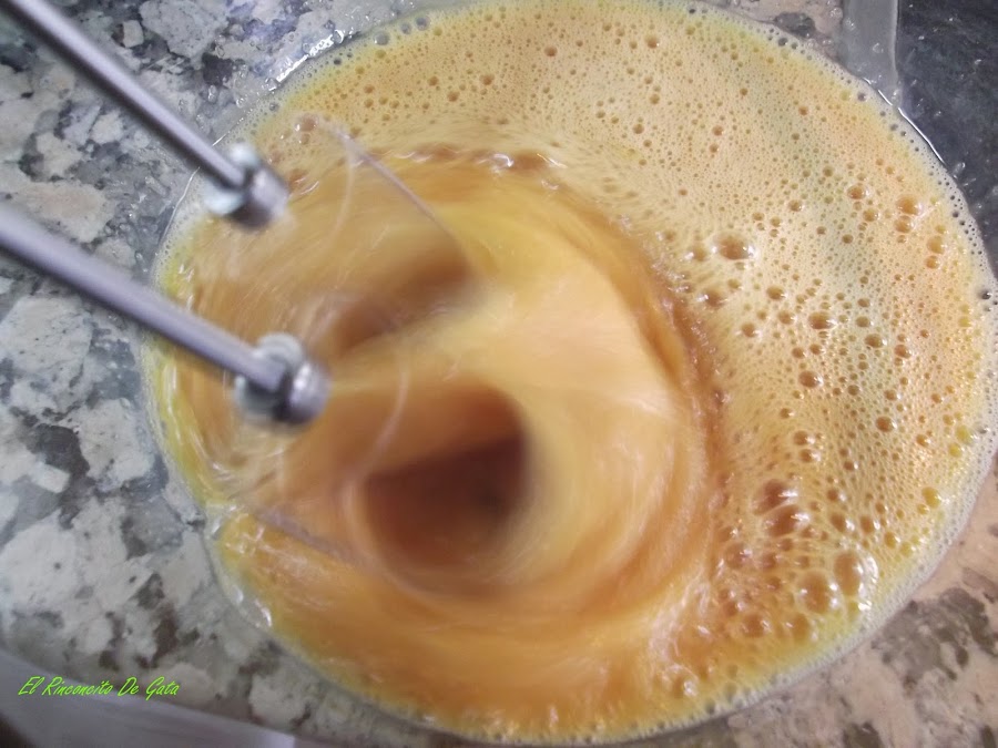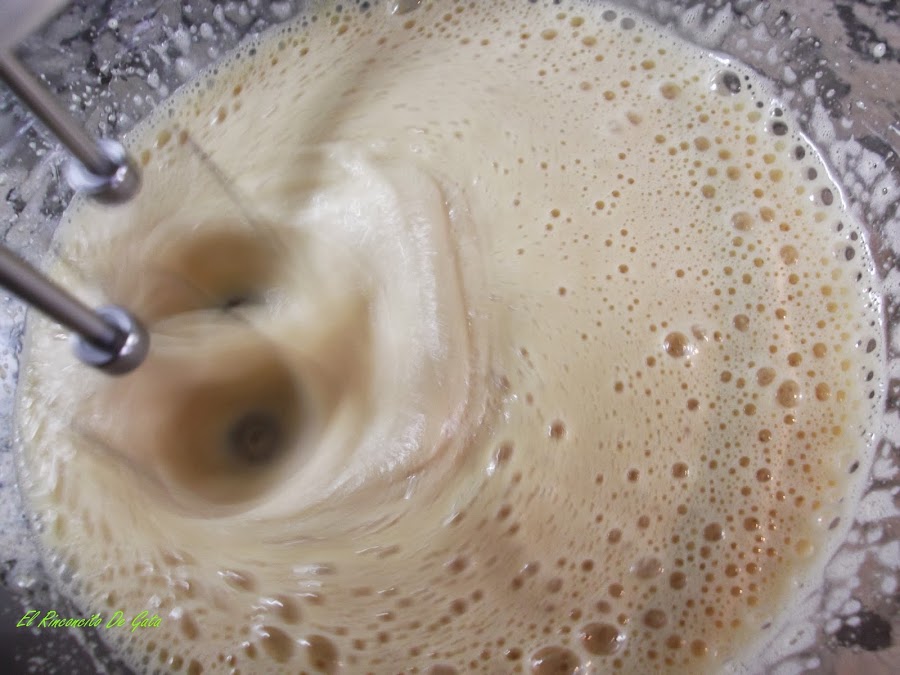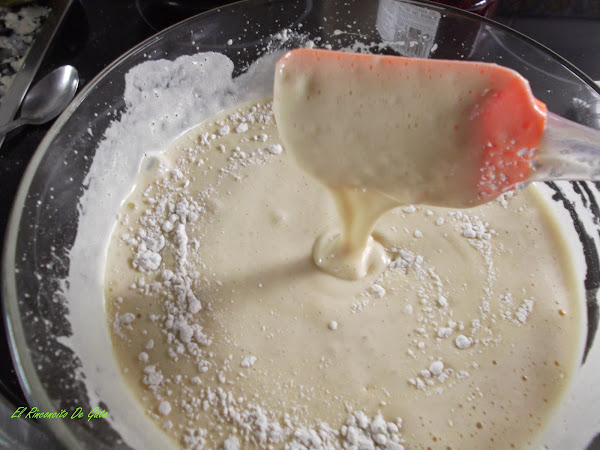 Cuando veamos que la masa ya no sube más, empezamos a añadir la harina con la levadura tamizada, hacerlo poco a poco y con movimientos envolventes, para que no se baje la masa.