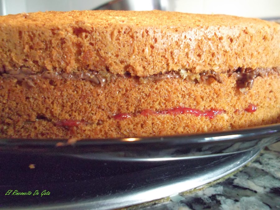 Ahora cubrimos con la placa de bizcocho del medio, esta la vamos a cubrir con una ligera capa de nocilla.