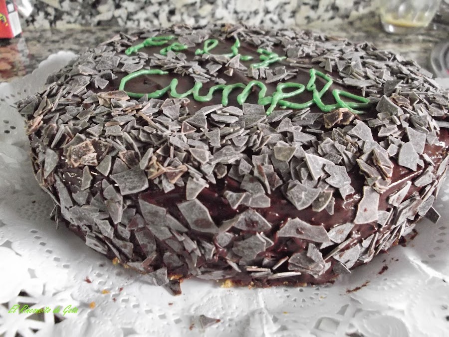 Siguiente paso, decorar, yo en este caso con unas virutas de chocolate negro que tenia en casa, creo que quedaría mejor con virutas negras y blancas.  Las letras están hechas con un gel que venden para ese fin, me falta coger soltura con este tema, es la primera vez que lo hago.