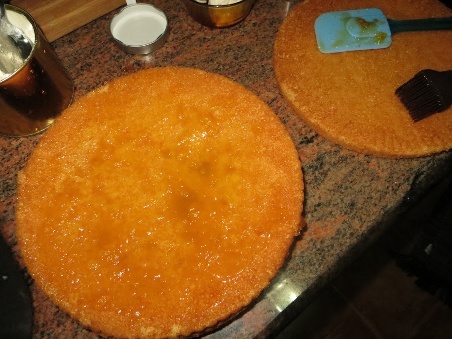 Cortáis el bizcocho por la mitad o en dos capas. Ponéis el agua con el azúcar a calentar y realizáis un almíbar. Untáis las diferentes caras del bizcocho con este almíbar y luego le echáis la mermelada de melocotón, no escatiméis para que el bizcocho no se quede muy seco.
