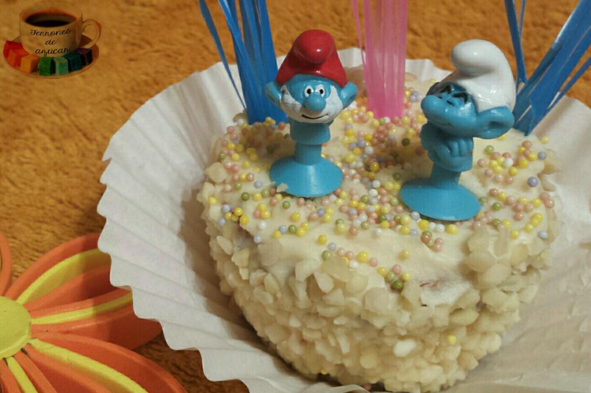 Ya queda poco, te lo aseguro. Si el bizcocho ya está frío, divídelo por la mitad y pon una capa generosa de la crema. Y con la ayuda de una espátula plana (o un cuchillo de untar) haz una capa fina por alrededor de todo el bizcocho. Ésta primera capa nos servirá para juntar toda la miga. Pon la tarta en la nevera para que se endurezca y pasados unos 20 minutos, haz una segunda capa de crema. Es en ésta segunda en la que vas a necesitar un poco de fuerza y rapidez. Coge las almendras laminadas naturales (sin tostar!) y cubre toda la tarta. Yo no encontré laminada y compré troceada, que para el caso es lo mismo. La tarta Sara original lleva una capa final de azúcar glas por encima de la almendra, pero yo no se la puse porqué no quería que fuera tan dulce. Y como tenía por casa un poco de bolitas de colores, quise darle un toque más de color a mis mini-monas.