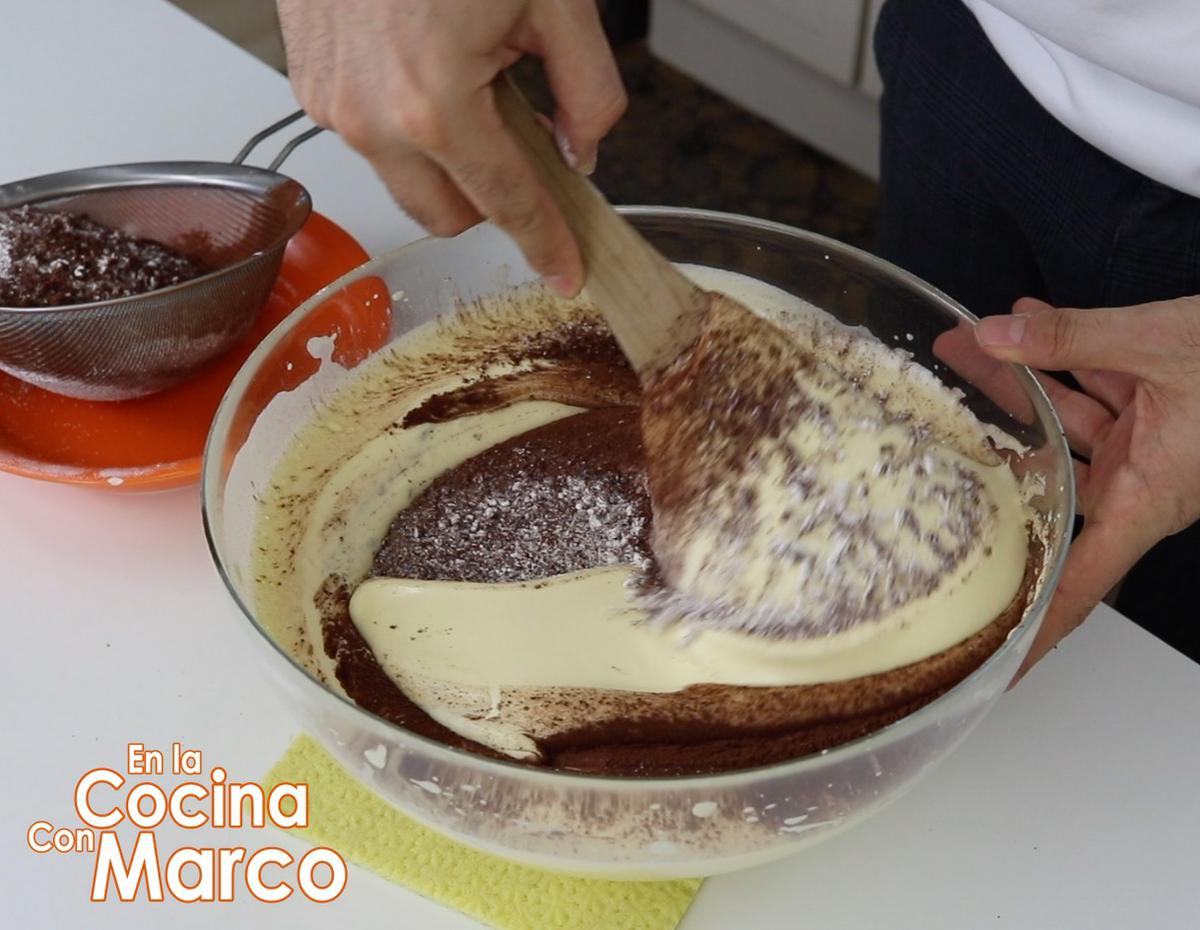 A continuación agregamos los ingredientes en polvo, poco a poco, y seguimos girando con una espátula hasta obtener una crema densa y uniforme. Para simplificar este pasaje yo coloco todos los ingrediente en polvo como la harina, la maicena, el chocolate en polvo y la levadura, en un colador y los voy tamizando directamente adentro del bol.