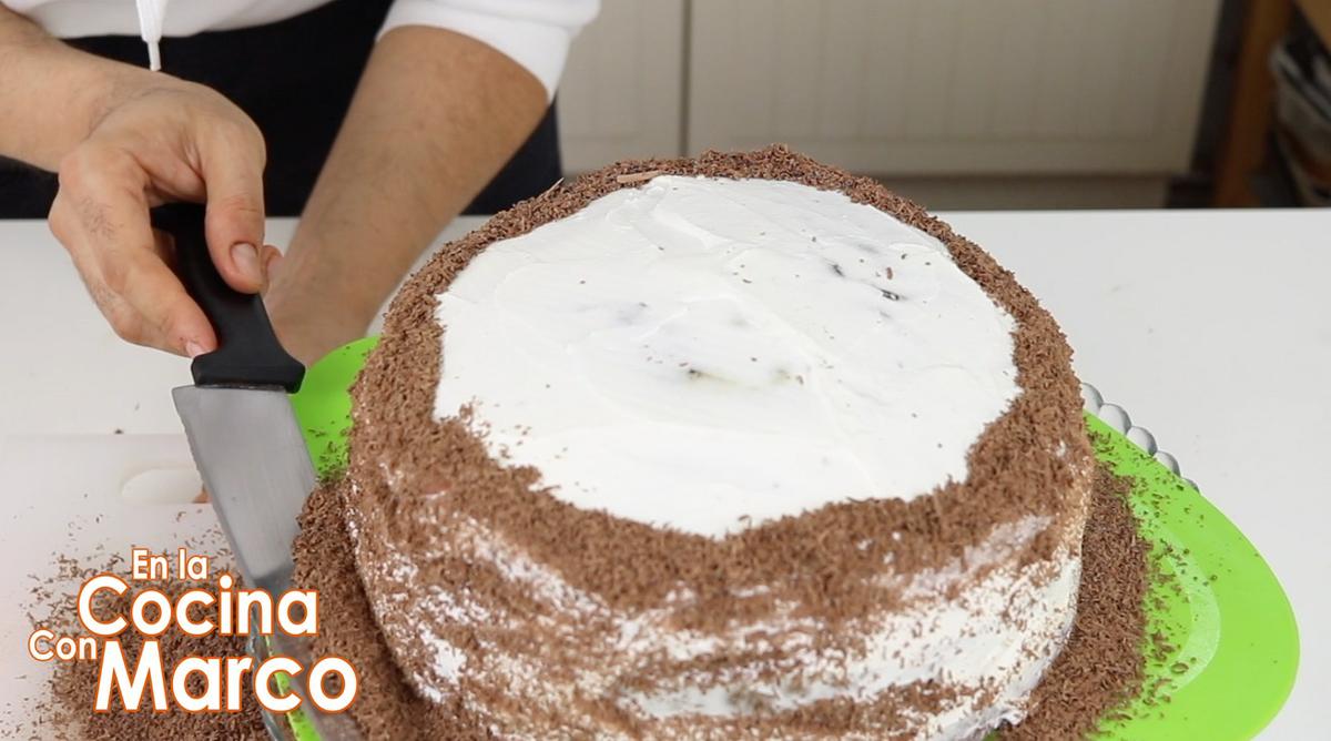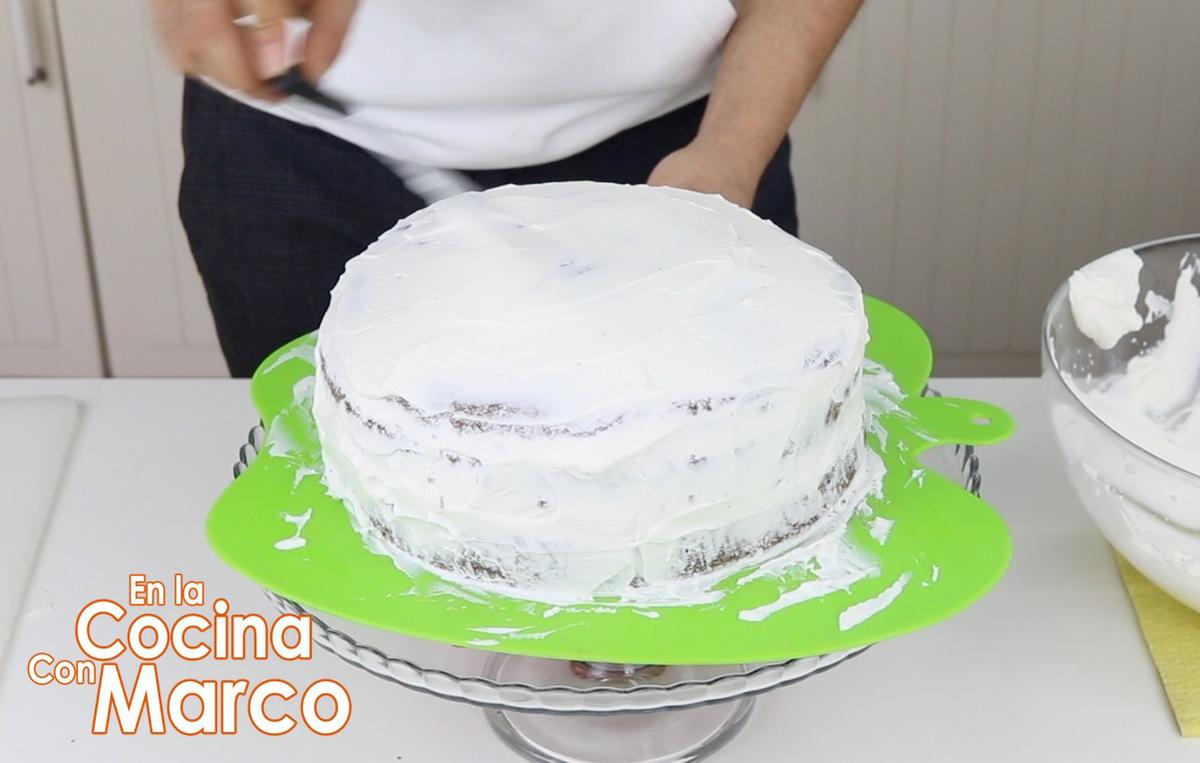 Con una espátula, o con un cuchillo largo, vamos a revestir completamente nuestra torta con la crema leche. No obstante nuestra torta parece bien firme, es recomendable colocarla en el refrigerador por una media, para estar seguros que se quede bien compacta.