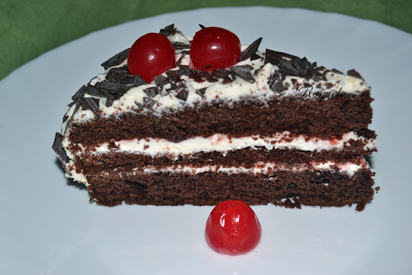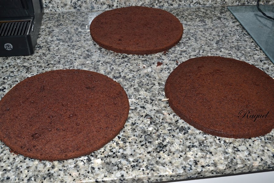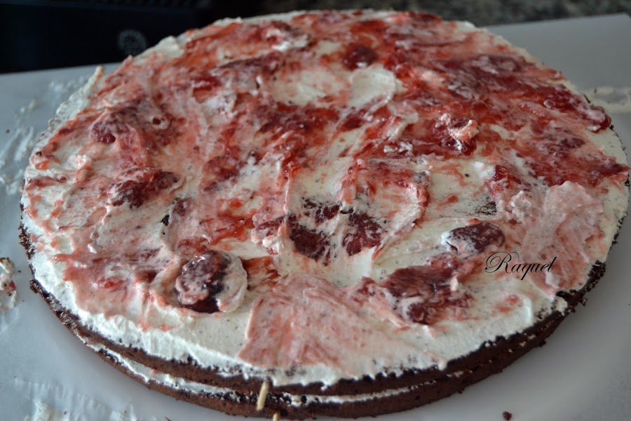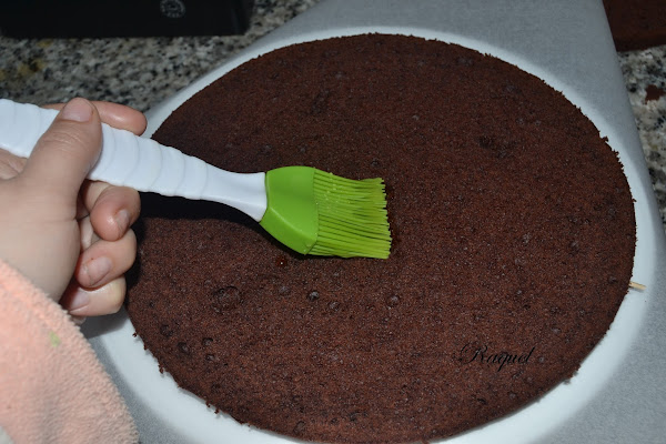 Empezamos a montar la tarta cogemos el primer disco y bañamos con el almíbar de las cerezas.