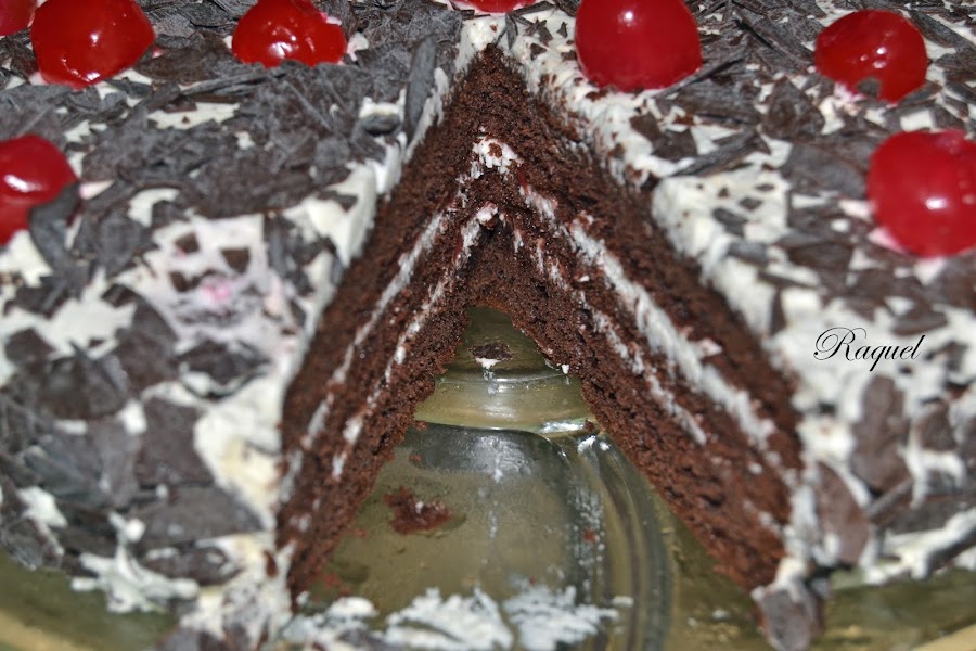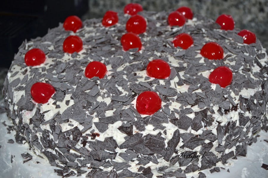 Ponemos las escamas de chocolate por todo alrededor de la tarta y por encima y por ultimo ponemos las cerezas repartidas por encima.