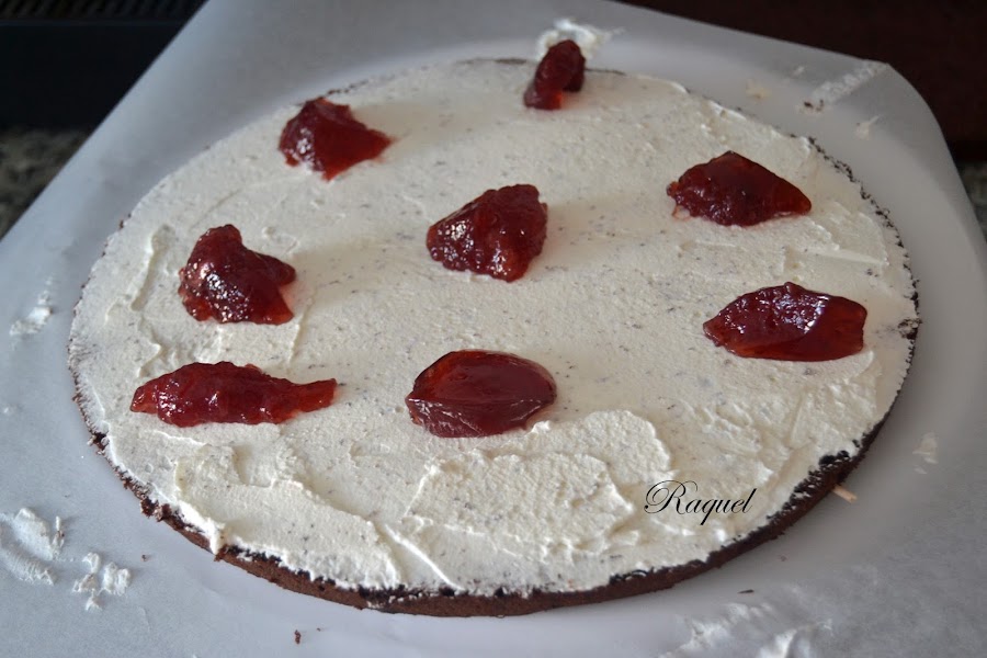 Echamos una capa de nata (crema de leche) y ponemos unas cucharadas de mermelada y lo repartimos por encima.
