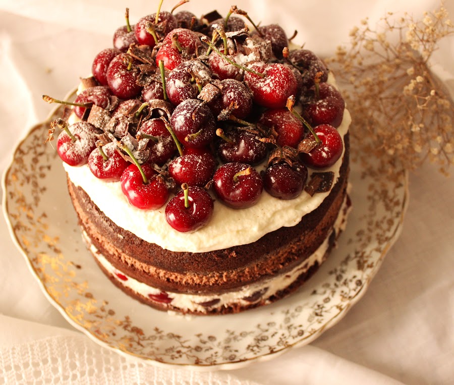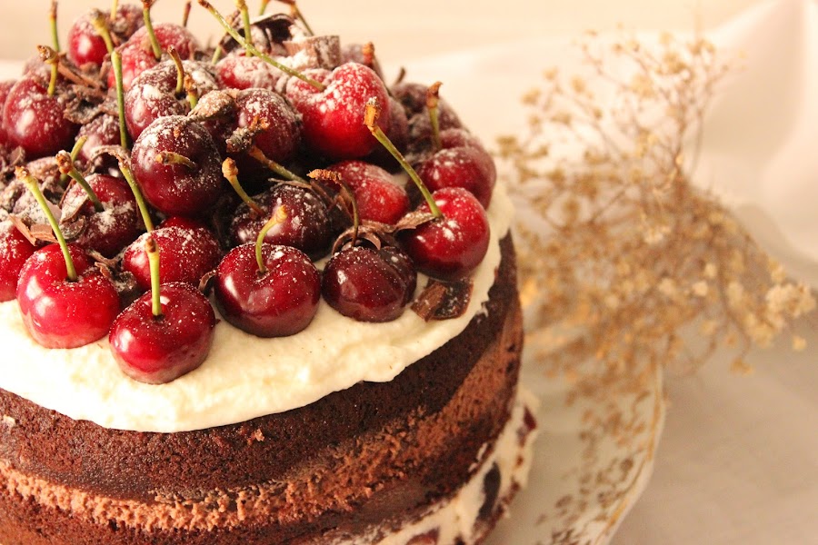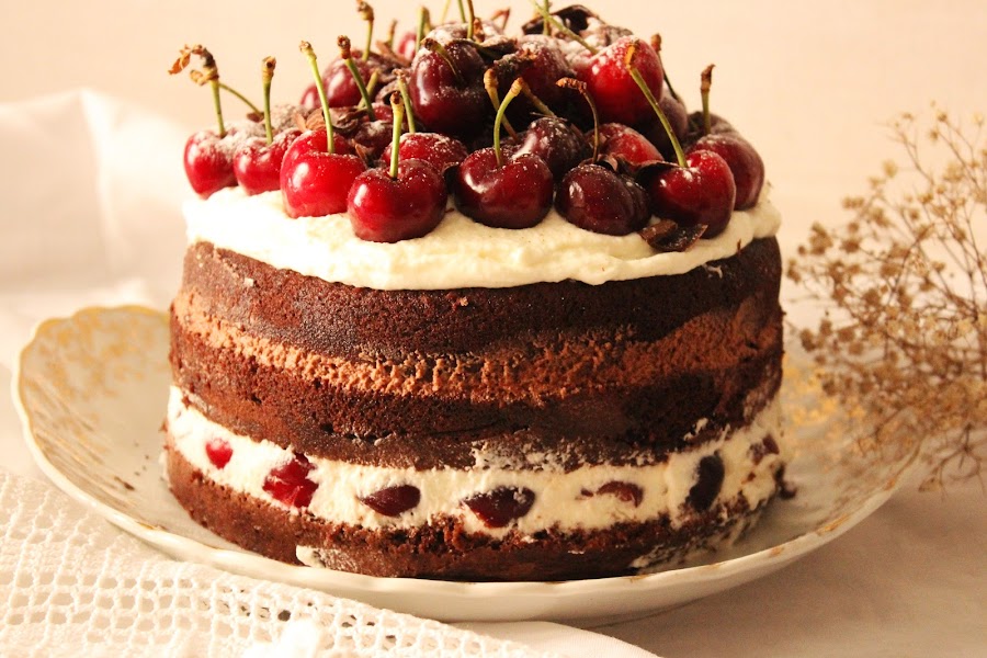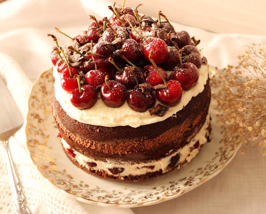 con vainilla, crema de trufa y cerezas maceradas con licor