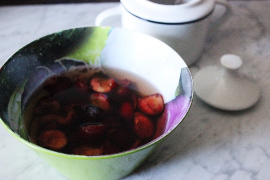 En un bol, ponemos como unas 12 cerezas deshuesadas y cortadas