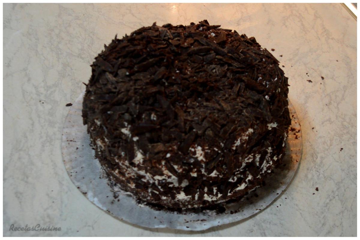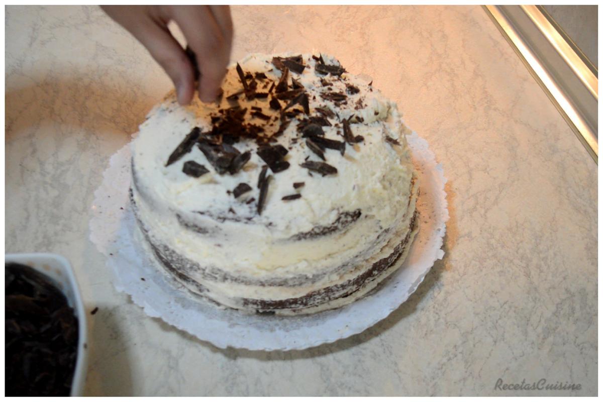 4. A continuación, cubrimos toda la tarta con las virutas de chocolate, presionando ligeramente para que se adhieran. Las podemos hacer rallando el chocolate o picando fino con un cuchillo. También se puden sacar virutas fundiendo el chocolate, estirándolo sobre una superficie lisa y dejar que enfríe. Una vez frío, lo iremos despegando con una espátula rígida, se irá rompiendo y obtendremos estas virutas.