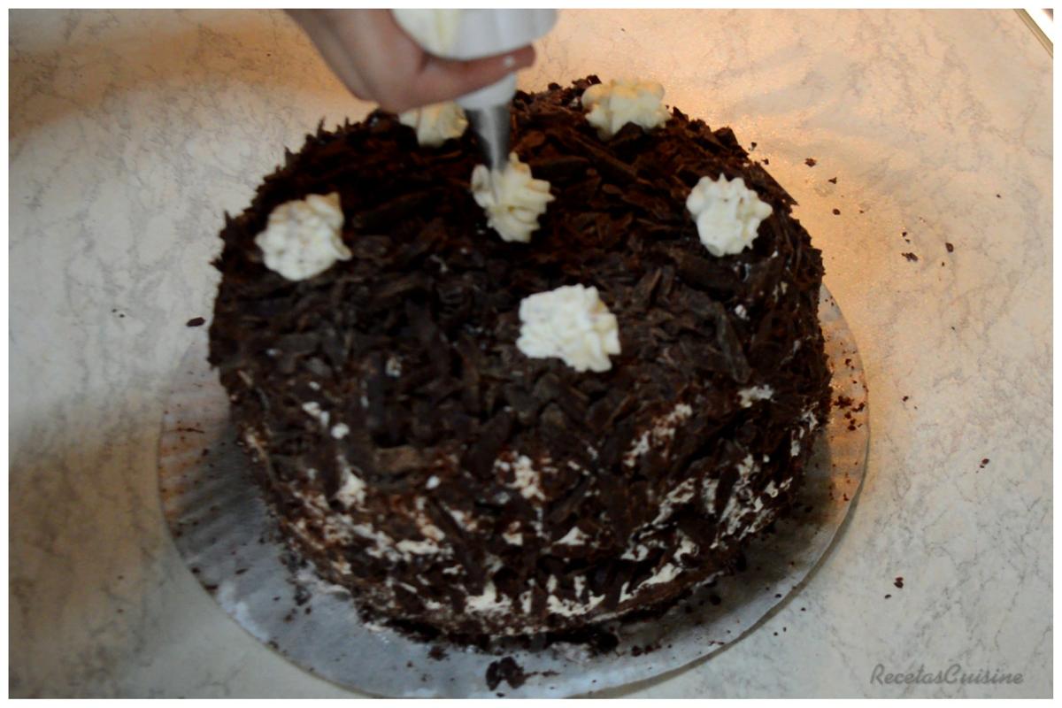 5. Por último, con una manga pastelera, hacemos unos rosetones encima de las virutas de chocolate, colocamos encima una cereza y guardamos en la nevera para poder servir pasado un tiempo.