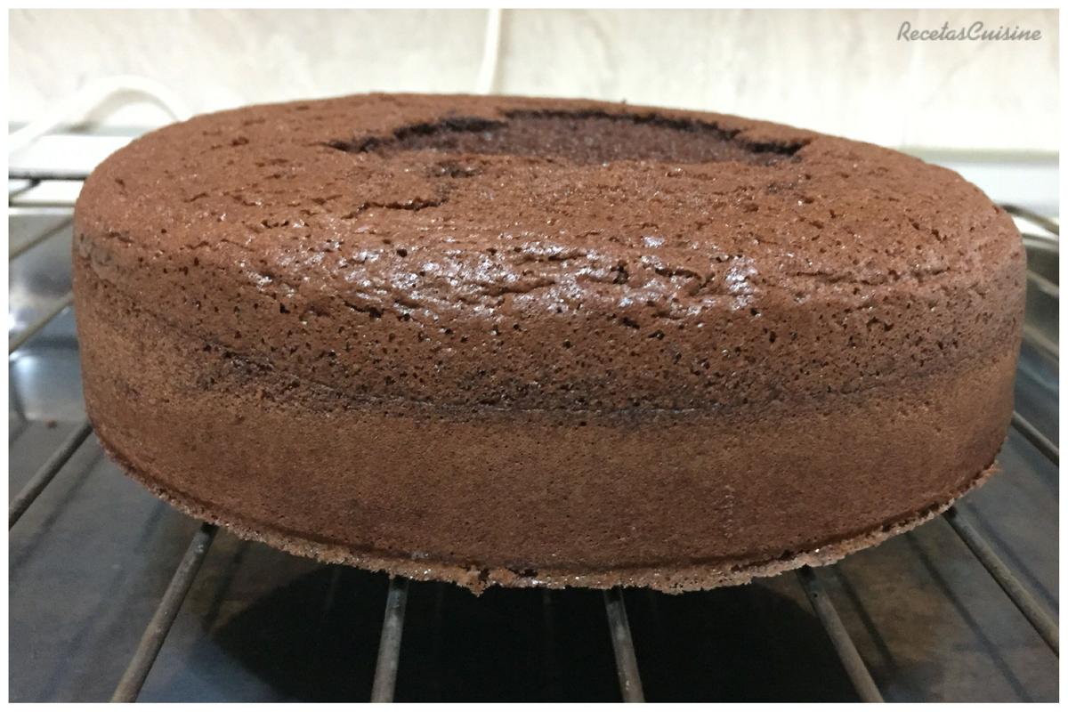 1. Cuando el bizcocho esté completamente frio, lo cortaremos con un cuchillo de sierra o una lira de repostería en tres discos iguales. Es importante que esté bien frío, porque si no, se nos podría romper al ir a cortarlo.