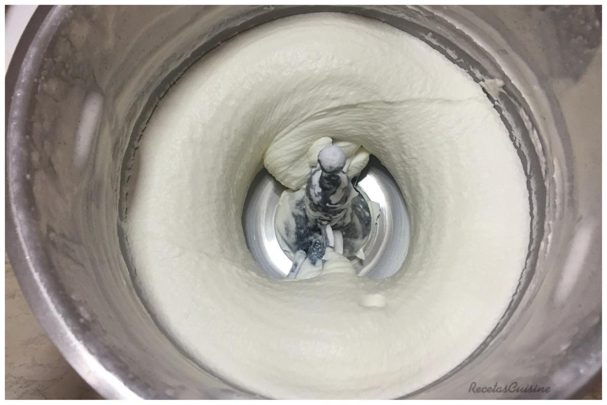 2. Cuando apreciemos que la nata (crema de leche) está semi montada, añadimos por el bocal el azúcar glass junto al sobre de azúcar avainillado. Continuamos batiendo hasta que esté firme, y por lo tanto, montada. Sabremos que está lista porque es sonido que hace al batir cambia, y va dejando surcos en las paredes del bol. Mientras dura el proceso (no podemos dar un tiempo fijo) estaremos pendientes en todo momento y pararemos justo a tiempo, porque de excedernos en el tiempo de batido, la nata (crema de leche) podría cortarse. Reservamos en un recipiente en la nevera.