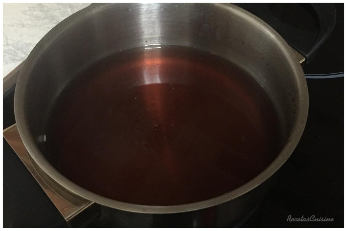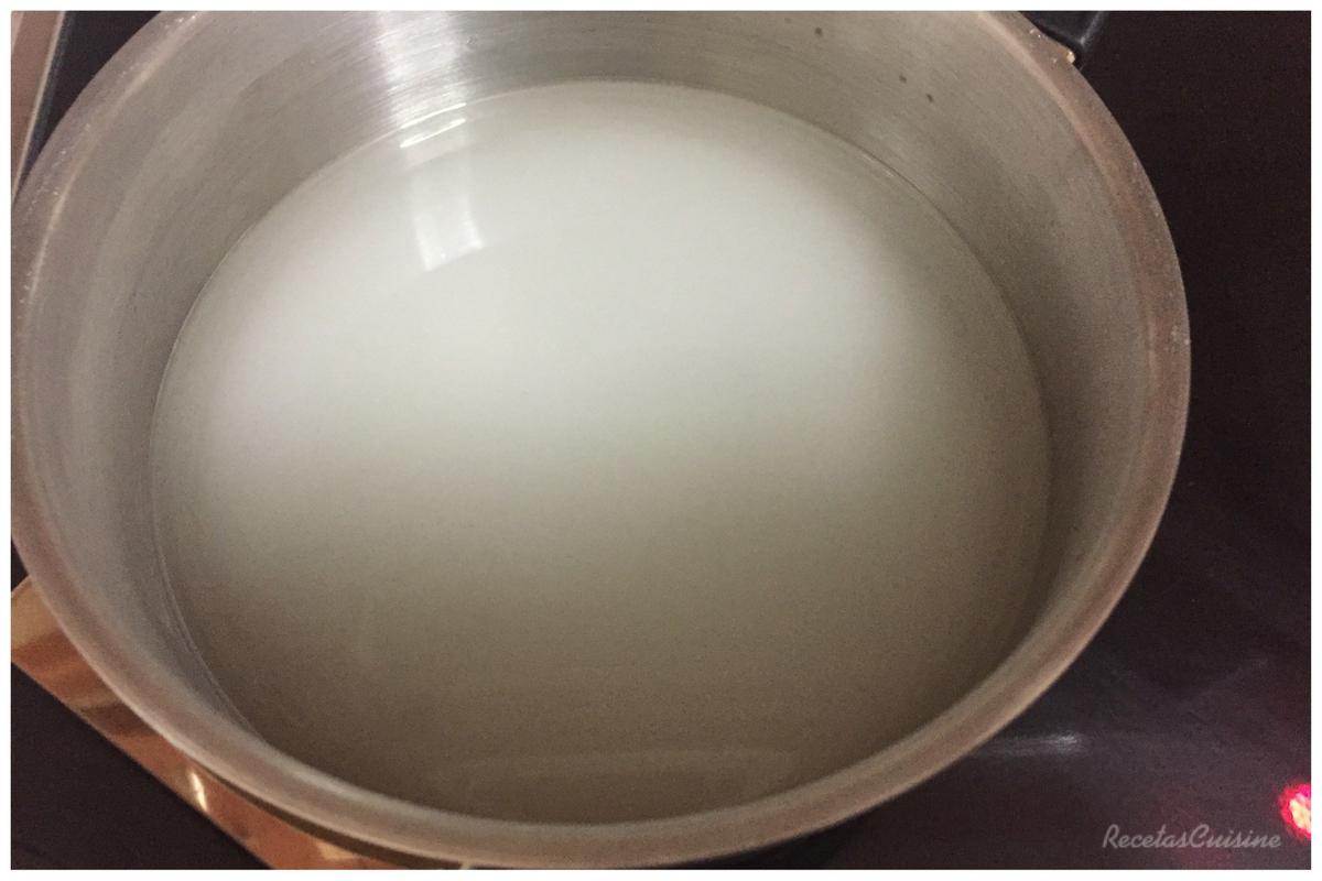 1. Ponemos un vaso de agua y otro de azúcar a fuego medio/bajo. Removemos y dejamos durante unos minutos hasta que se forme un almíbar.
