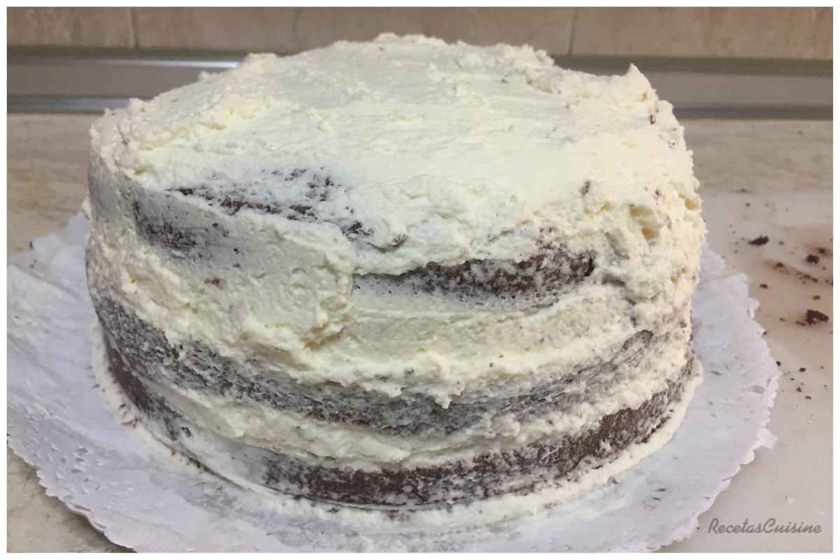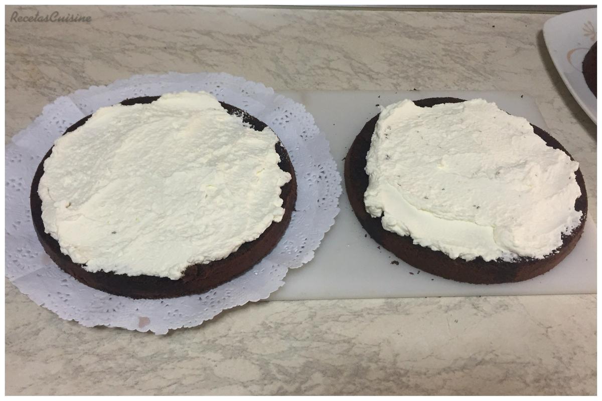 3. Colocamos un disco encima del otro, y por último, colocamos el tercero que nos falta. Cubrimos todo con nata (crema de leche) (dejamos un poquito de nata (crema de leche) para hacer luego unos rosetones para decorar).