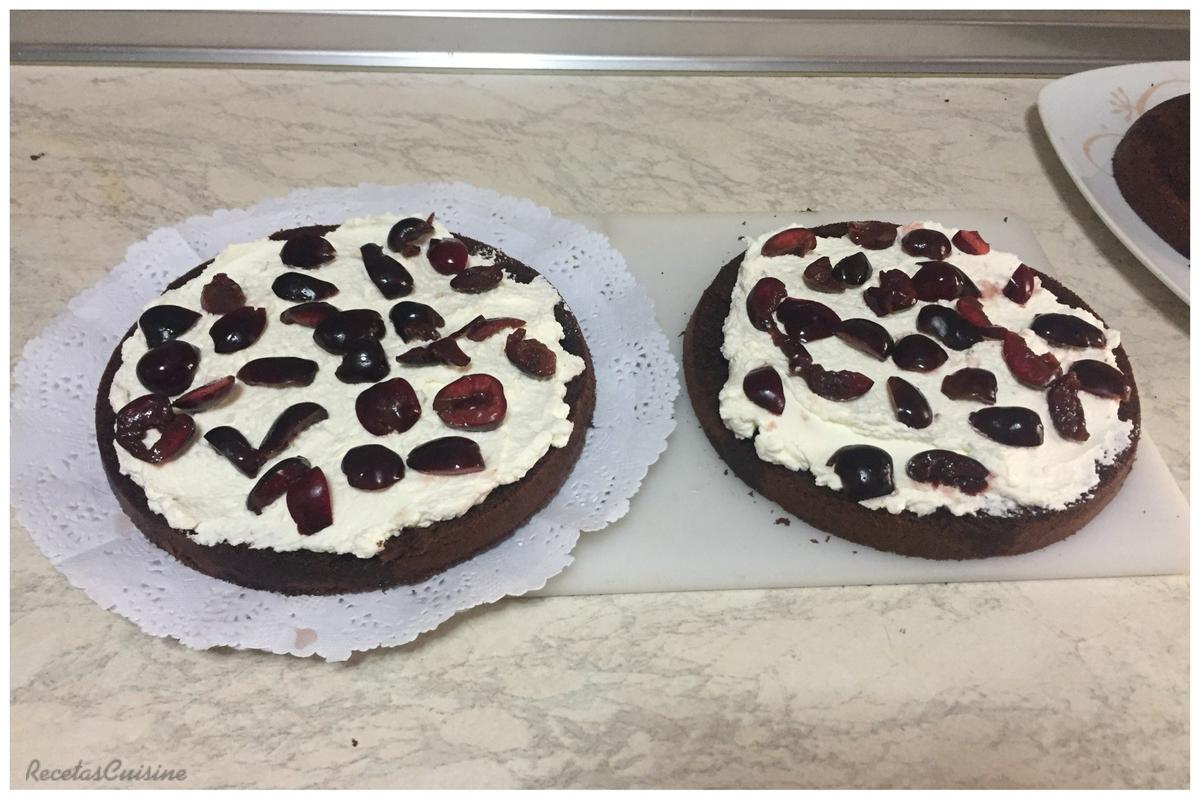 2. Colocamos los discos en nuestra superficie de trabajo y los empapamos con el almíbar. Sobre dos de ellos, extendemos una capa generosa de nata montada (crema de leche) y sobre ella, repartimos las cerezas macereadas, que tendremos picadas a nuestro gusto.