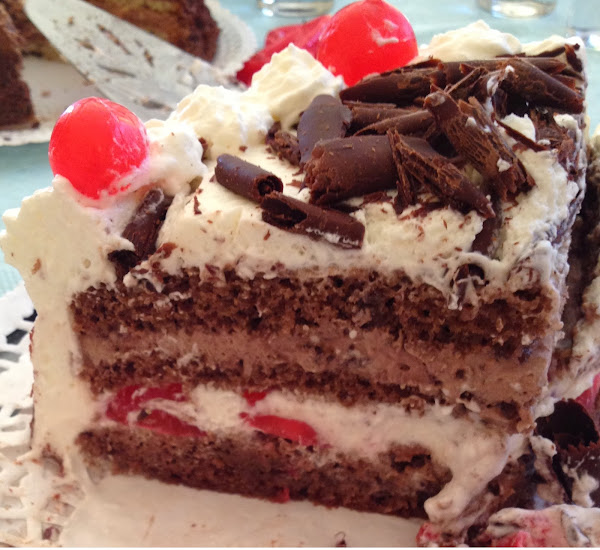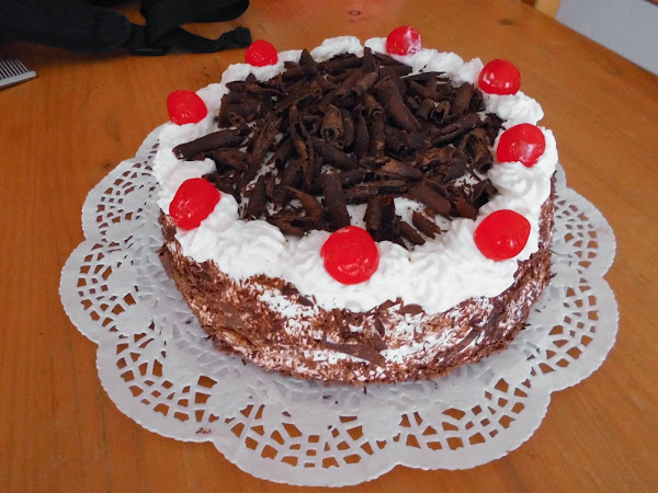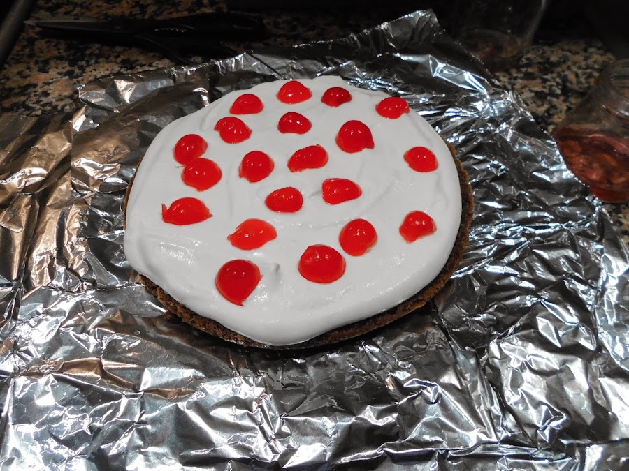 Ponemos un bizcocho lo pintamos con el almíbar, añadimos la nata (crema de leche) y las guindas que teníamos en ron.