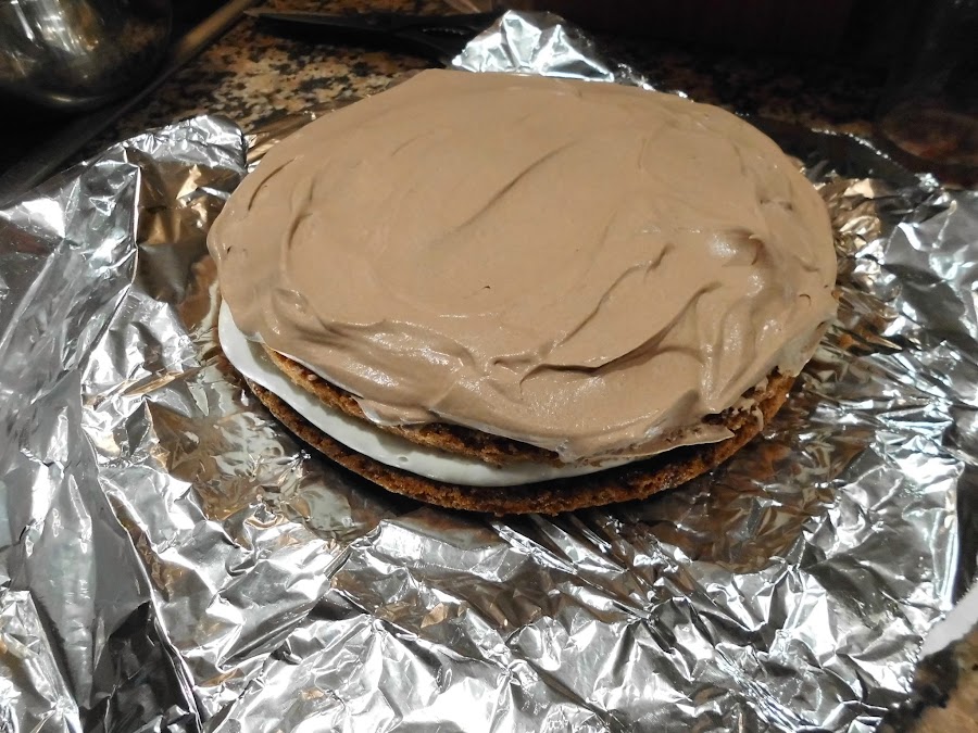 Ponemos otra capa del bizcocho, la pintamos con el almíbar y le ponemos la crema de chocolate.