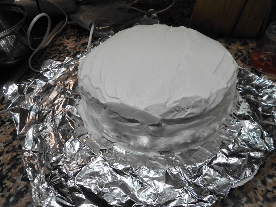 Ponemos la capa final, la pintamos también con el almíbar, forramos toda la tarta con la nata (crema de leche).