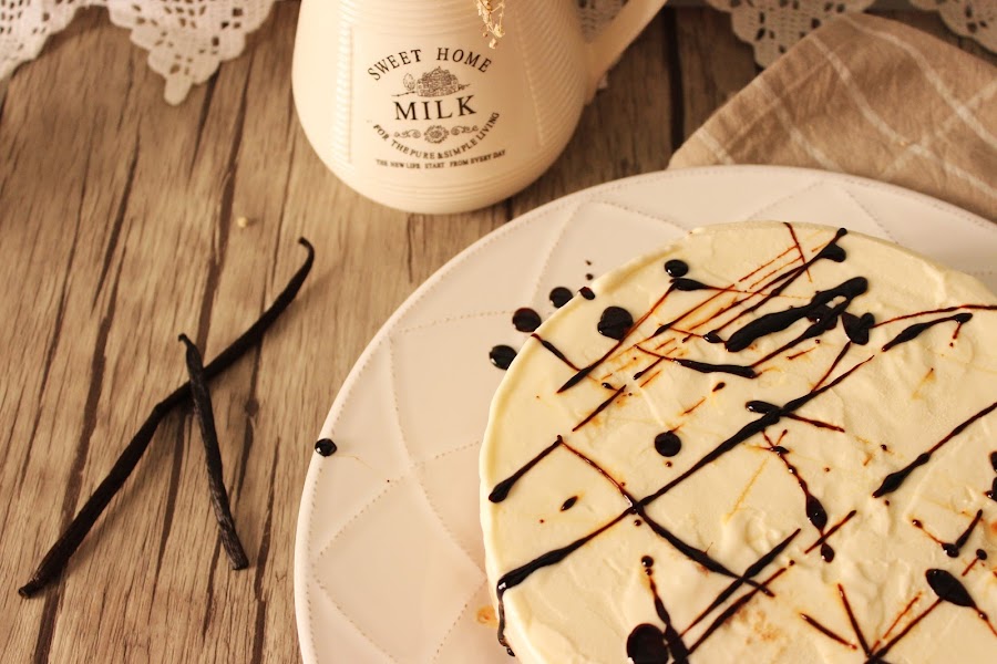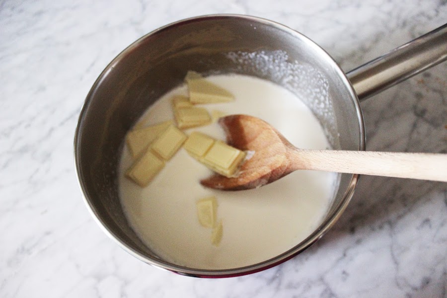 La mousse es una mezcla de leche infusionada con vainilla y chocolate blanco con nata (crema de leche) semimontada, súper cremoso.