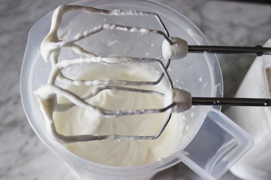 Batir la nata (crema de leche) con unas varillas hasta que esté semimontada.