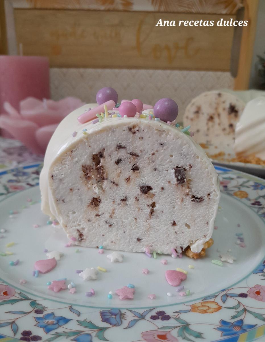Hoy te enseño a elaborar una riquísima tarta semifría de mousse de stracciatella, tiene una textura suave y cremosa, cubierta por un delicioso glaseado espejo de chocolate blanco, ahora que ya empieza el calor, apetece tomar tartas frías que dejamos en la nevera hasta el momento de degustarlas.