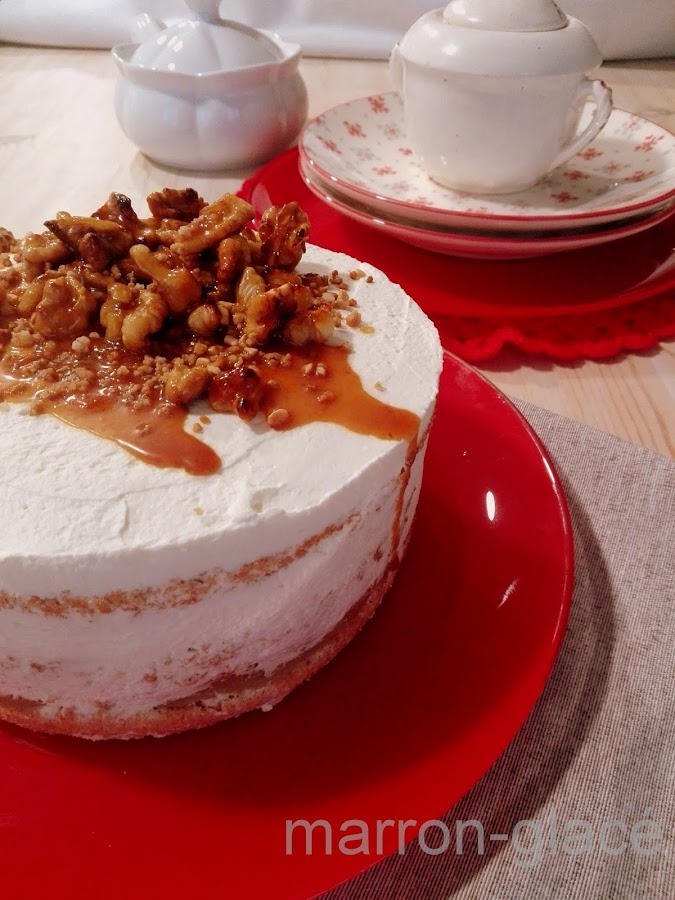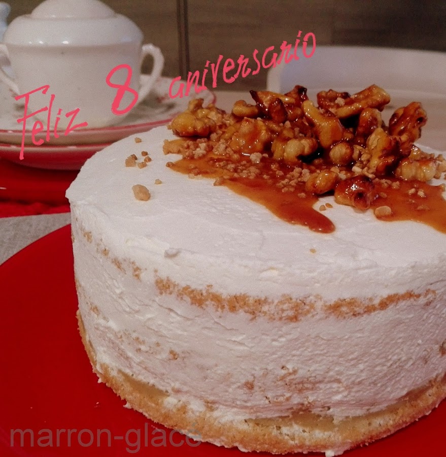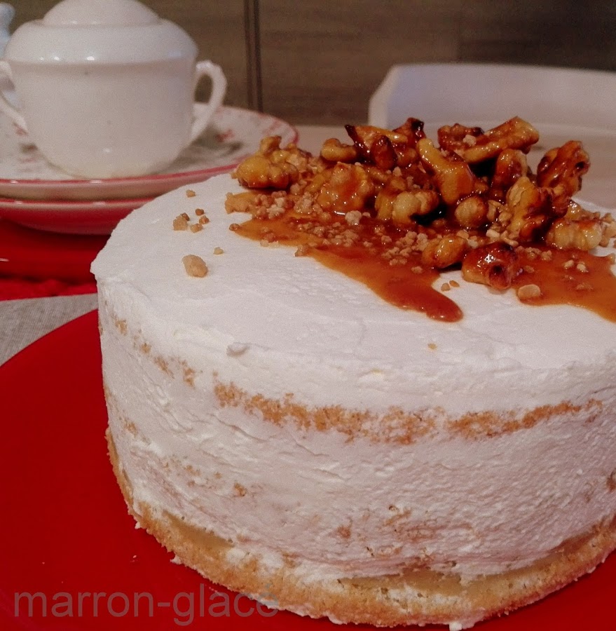 Sacar la tarta,cubrir con nata (crema de leche) que tenemos reservada.Adornar con el caramelo y nueces.Con cuidado que no esté muy caliente para que no derrita la nata (crema de leche).