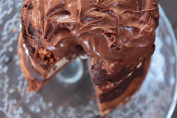 Calentar hasta que hierva la nata (crema de leche) a fuego lento. Cortar el chocolate en trozos pequeños y ponerlos en un bol. Volcar la nata (crema de leche) hirviendo sobre el chocolate y dejarlo unos minutos atemperar. Con varillas removemos desde el centro hacia el exterior de las paredes del bol. Cuando está totalmente deshecho y brillante le añadimos la mantequilla troceada y seguimos moviendo con la varilla para que se integre perfectamente.Montaje de la tarta: