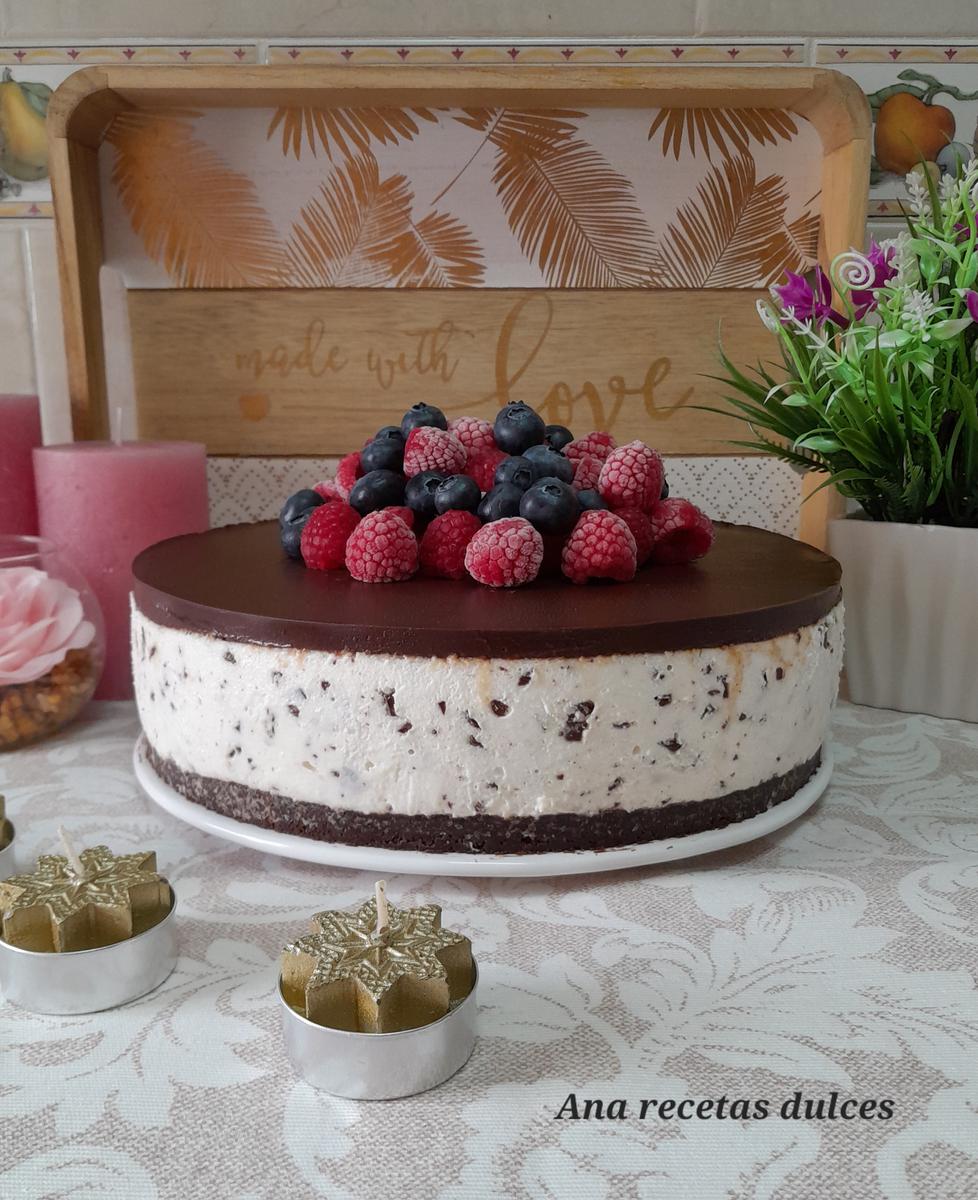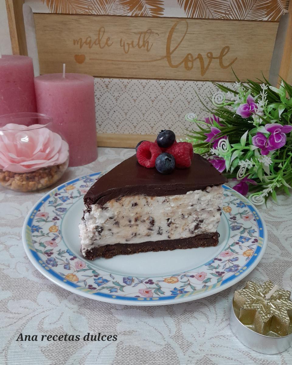 Es una tarta fría sin horno llena de sabor, tiene una base crujiente de galletas chocolateadas, un suave y cremoso relleno sabor a stracciatella con trocitos crujientes de chocolate y una deliciosa cobertura de chocolate negro.