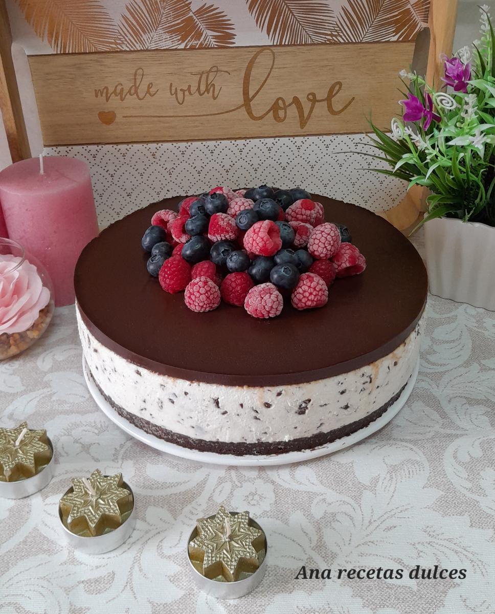 Al día siguiente, desmoldamos la tarta y decoramos a nuestro gusto (yo la he decorado con frambuesas y arándanos).