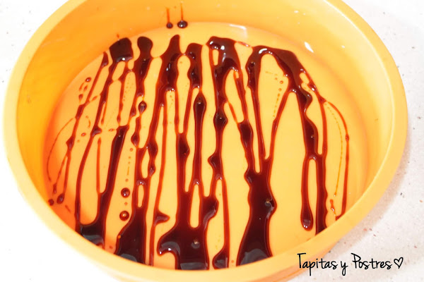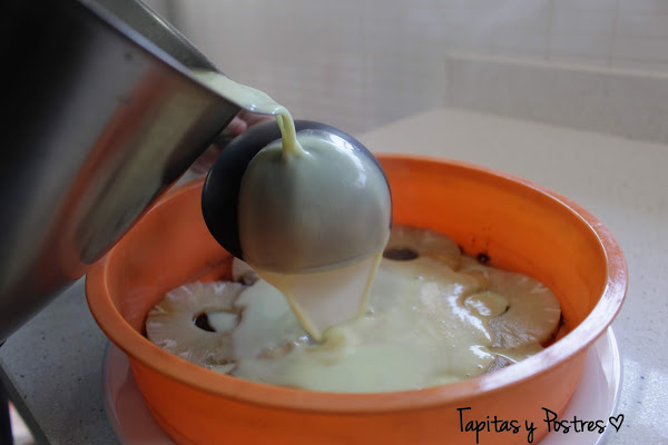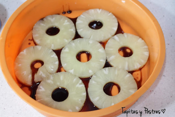En el molde, ponemos un poco de caramelo liquido, no mucho, solo unos hilos para que se "peguen" las rodajas de piña y no se muevan cuando vertamos la masa.