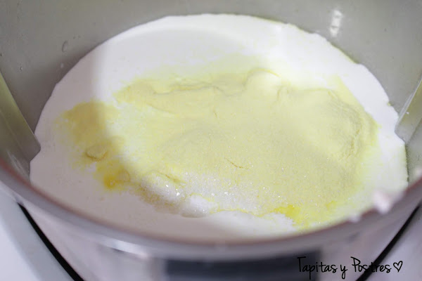 Si no tenéis thermomix pondremos la nata (crema de leche), azúcar, rodajas de piña, jugo y sobres de gelatina en el vaso de una batidora y trituramos hasta que tengamos una crema fina. A continuación la calentamos en un cazo amplio removiendo durante unos cinco minutos. No dejéis que hierva. Cuando esté bien caliente, añadimos la gelatina neutra y seguimos removiendo hasta que esté todo bien integrado.