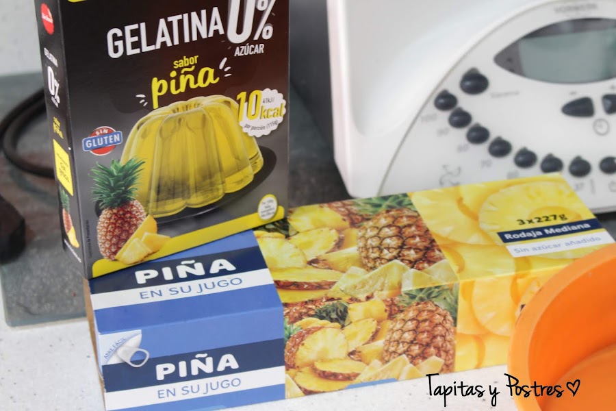 Esta es la gelatina que he usado y la piña. Los compré en Mercadona, pero podéis poner las marca que queráis.