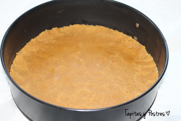Y colocamos esta mezcla en el fondo de un molde desmoldable. Dejamos en la nevera un rato.