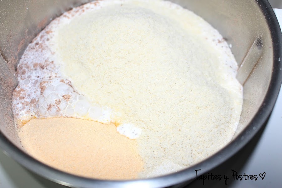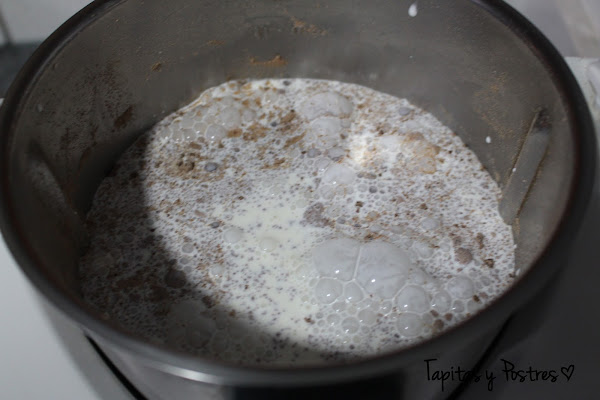 Pulverizamos el chocolate 15 segundos a velocidad progresiva 5-10. Añadimos la nata (crema de leche), los sobres de flan y la almendra molida. Cocinamos 10 minutos a 100º y velocidad 4.